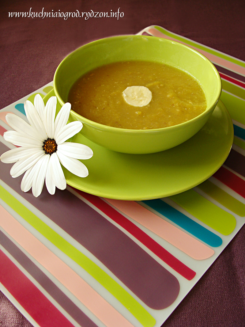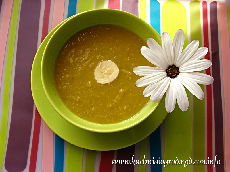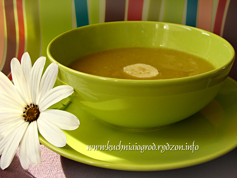 Zupę miksujemy i gotujemy jeszcze ok. 3 minut. Ozdabiamy plasterkami banana.