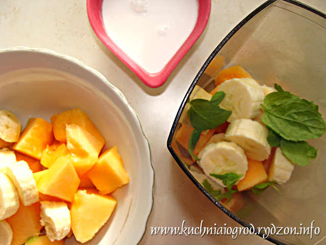 Melona i banana pokroić na kawałki. Wrzucić do blendera razem z miętą i zmiksować. Pod koniec dodać mleczko kokosowe. Schłodzić.