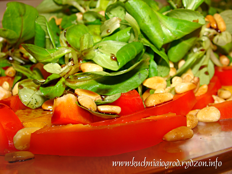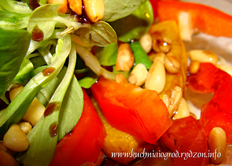 Na suchej patelni zarumienić pestki pinii. Ocet balsamiczny wymieszać z olejem z pestek dyni oraz miodem (aż miód się rozpuści). Dodać troszkę soli i opcjonalnie odrobinę tabasco. Jeśli ktoś nie lubi ostrych przypraw, to bez tabasco tej przystawce naprawdę niczego nie brakuje.