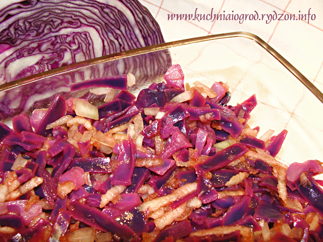 Co tu zrobić z główką czerwonej kapusty? Na pewno surówkę, tylko inną niż wczoraj:-) Tym razem kapustę trzeba ugotować. Bardzo podoba mi się jej kolor po ugotowaniu:-)