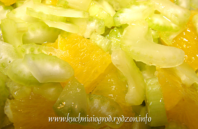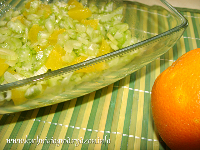 W salaterce ułożyć na przemian seler i cząsteczki pomarańczy, polać sosem.