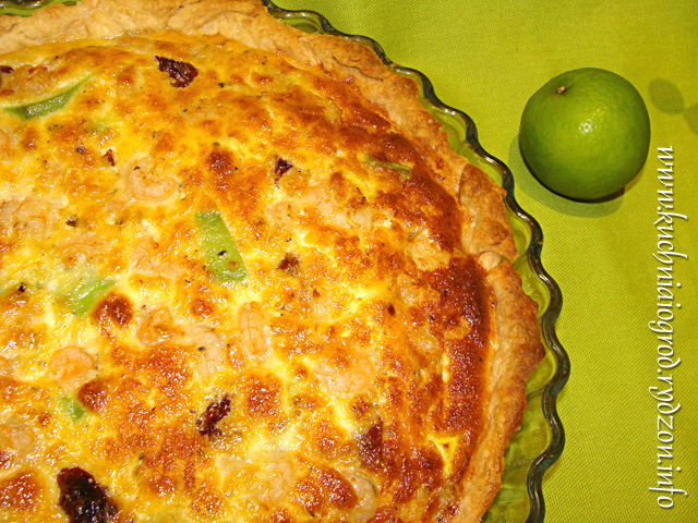 Ciasto wylać na podpieczony spód, ułożyć krewetki delikatnie je wciskając w masę. Piec przez 25 – 30 minut, aż masa się zetnie i lekko zrumieni.