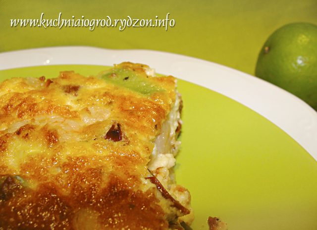 W misce roztrzepać jajka ze śmietaną i serem, doprawić solą oraz dużą ilością pieprzu. Awokado obrać, przekroić na pół, wyjąć pestkę a miąższ pokroić na kawałeczki średniej wielkości. Skropić sokiem z limonki. Awokado oraz suszone, pokrojone pomidory dodać do masy z jajek.