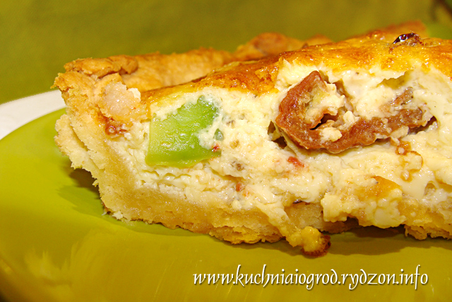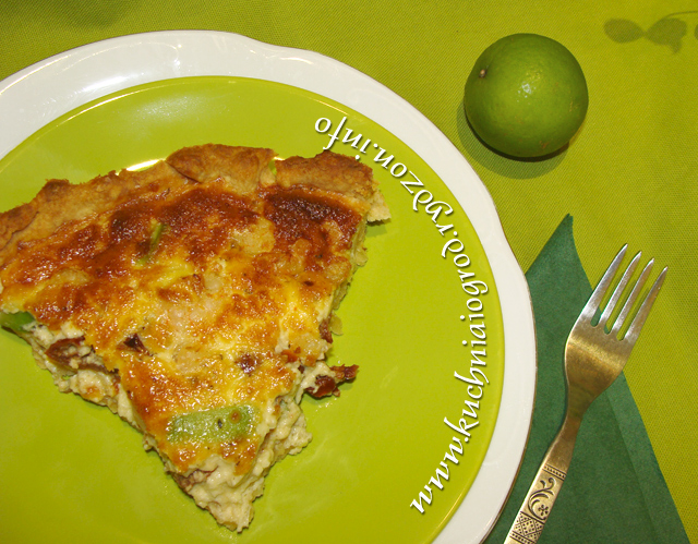 Piekarnik nagrzać do 200 stopni. Ciasto rozwałkować i wyłożyć nim formę na tartę. Spód ponakłuwać widelcem. Wstawić do piekarnika na 20 minut.