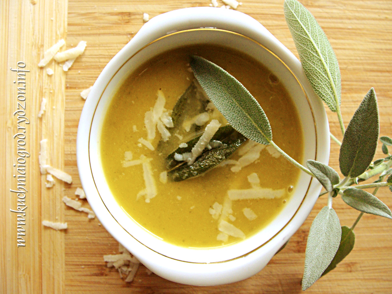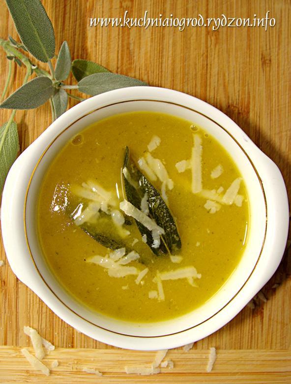 Zupę na talerzu udekorować podsmażonymi liśćmi szałwii i posypać serem